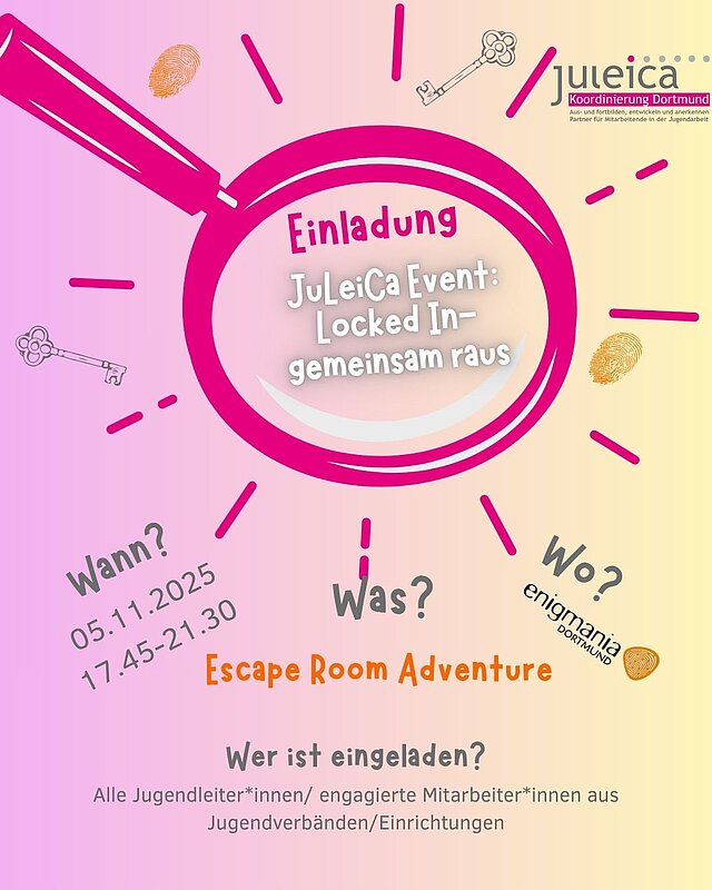 Habt ihr Lust, spannende Rätsel zu lösen? Als Dankeschön für euer Engagement laden wir euch herzlich ein, in den Escaperooms von Enigmania Dortmund gemeinsam den Dingen auf die Spur zu kommen. Im Anschluss können wir gemeinsam in der Geschäftsstelle des Jugendring bei einem kleinen Imbiss den Abend gemütlich ausklingen lassen. Seid dabei. Weitere Infos findet ihr hier.